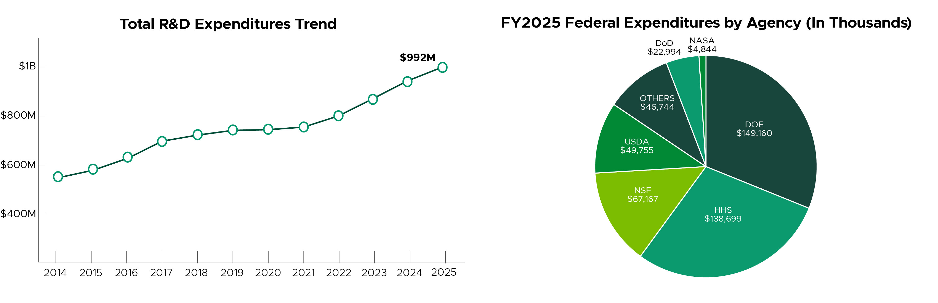 MSU's total research expenditures were $992 million for FY2025, an increase of 6.5% over the 2024 total of $932 million. Research expenditures from federal sources totaled $474 million, an increase of $39 million or 9%.